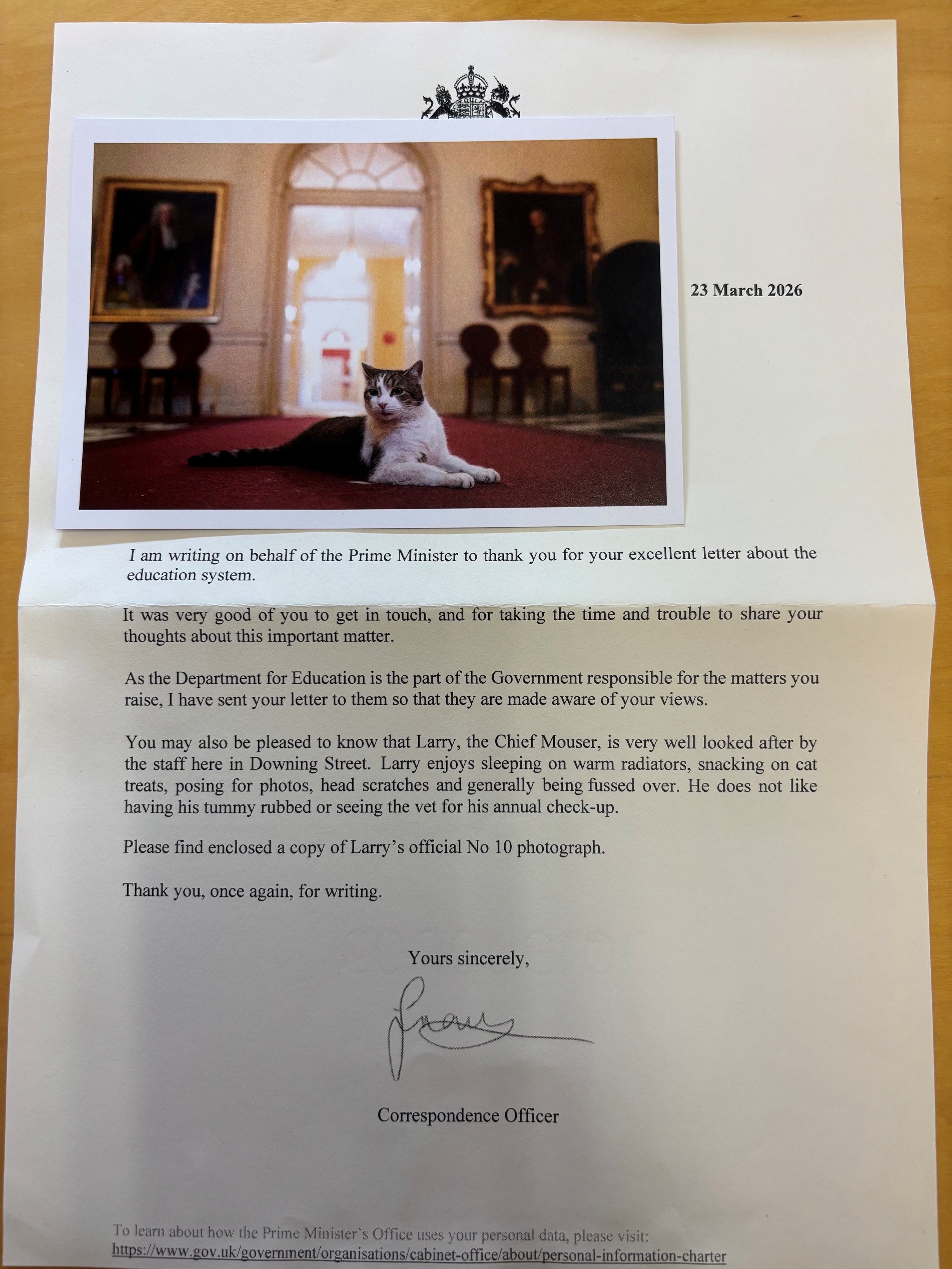 We were delighted to receive a reply, which included a thoughtful responseβ¦ and a very special addition β a lovely picture of Larry the cat from 10 Downing Street! πΎπ¬π§